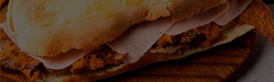 Milanesa (carne o pollo), pan ciabatta de queso, rúcula, tomate y cheddar